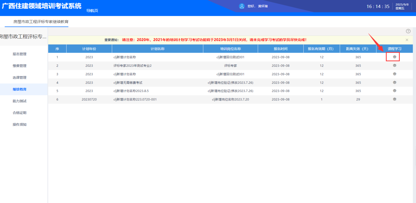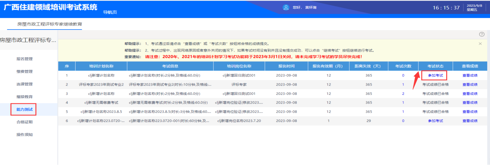 本次继续教育采用线上形式进行,评标专家在“广西建筑市场监管云平台”(以下简称“桂建云”)完成报名(详见附件)后,即可参加线上继续教育。所有继续教育视频均需完整观看,观看进度达100%方可进入能力测试环节。能力测试得分达60分及以上并通过审核的评标专家可取得继续教育合格证明,成绩审核时间为5个工作日。如第一次能力测试成绩不合格,可补测1次,补测截止时间:2024年11月25日23:59。
