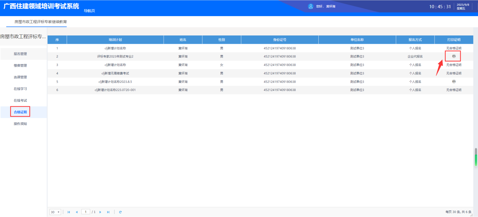 能力测试成绩审核通过后,即可在“合格证明”模块查看、打印合格证明。