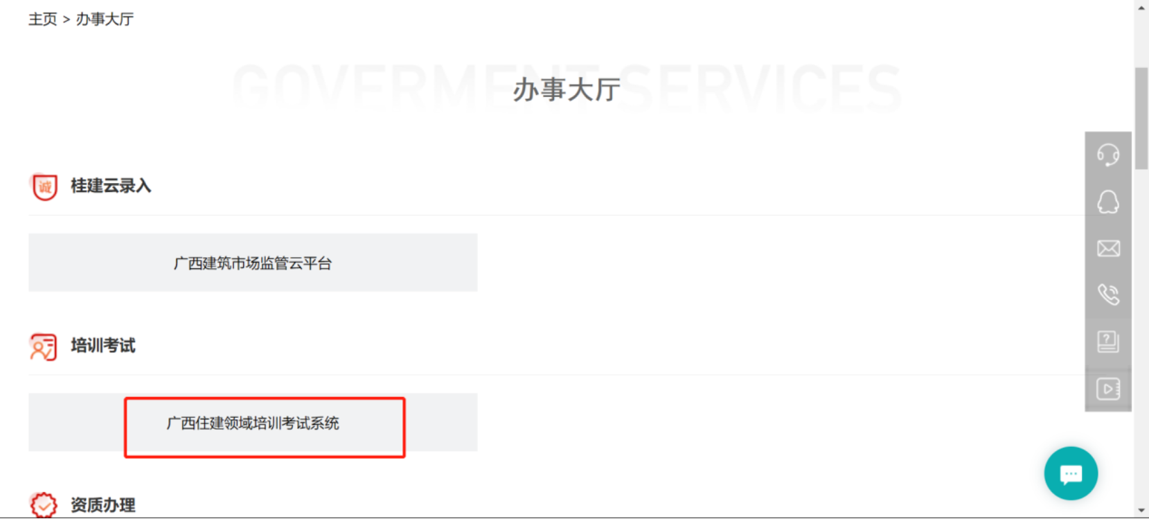 选择“办事大厅”—“广西住建领域考试培训系统”(该系统支持大部分主流浏览器)。