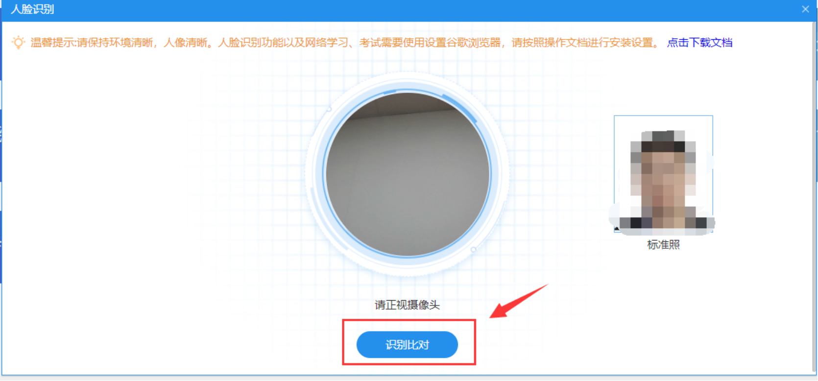 1.1.2维护基本信息后进入人脸识别页面,需摄像头对准人脸后进行人脸识别(如识别不通过请核对相片是否清晰,以及摄像头是否正常)。