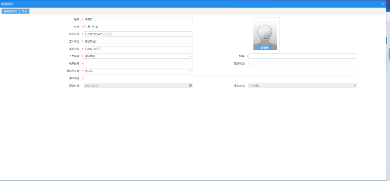 填写个人信息,上传所需附件,核对无误后保存并关闭(注意填写信息时请核对报名信息是否有误,如姓名、身份证等字段是否正确,保存并关闭即是提交报名,提交后报名信息不可修改)。