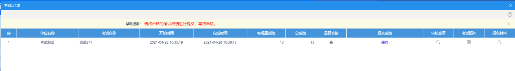 进入“能力测试记录”界面,可查看能力测试成绩是否合格,如果成绩不合格,点击对应能力测试计划“补测”按钮进行补测。如果补测一次仍不合格,则本次能力测试不通过。若成绩合格,点击“提交”等待主管部门审核能力测试记录。如果审核不通过,可点击“审核查看”按钮查看不通过原因。